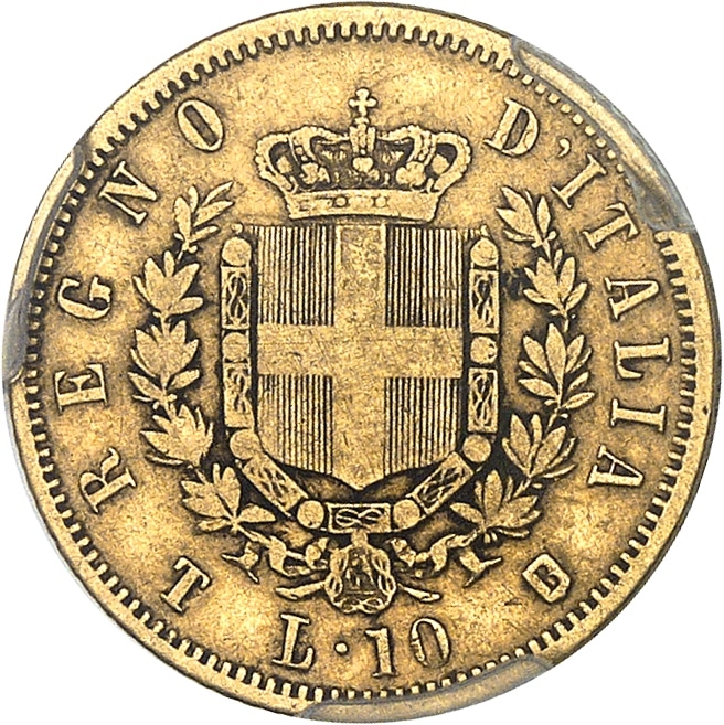 Les 10 lire de 1861 furent retirées de la circulation à partir de 1865, leur diamètre de 18 millimètres ne respectant pas la prescription de l’Union monétaire latine de 19 millimètres