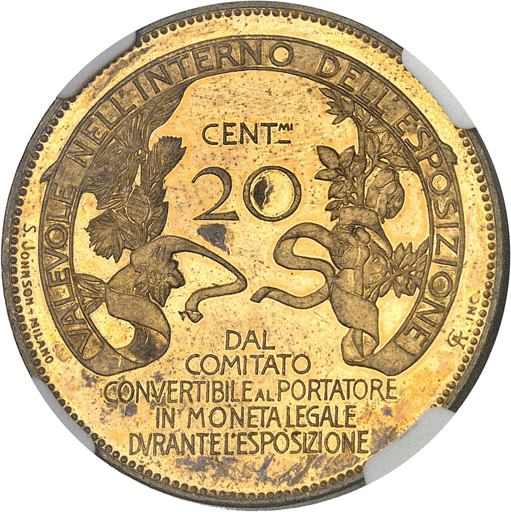 Rv. VALAVOLE NELL’ INTERNO DELL’ ESPOSIZIONE sur un bandeau replié en colonnes de fleurs. Au centre : CENTmi / 20 et plus bas DAL / COMITATO / CONVERTIBILE AL PORTATORE / IN MONETA LEGALE / DVRANTE L’ESPOSIZIONE : signatures S. JOHNSON - MILANO et AC INC.