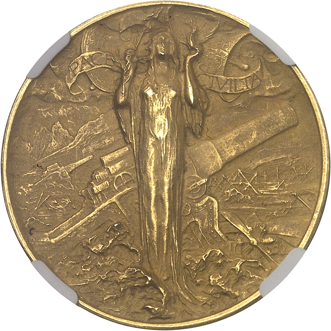 Rv. PACE CIVILTA. Devant un paysage de guerre, avec des canons et des barbelés, une allégorie de la Paix levant une branche de laurier et une lumière dans le ciel.