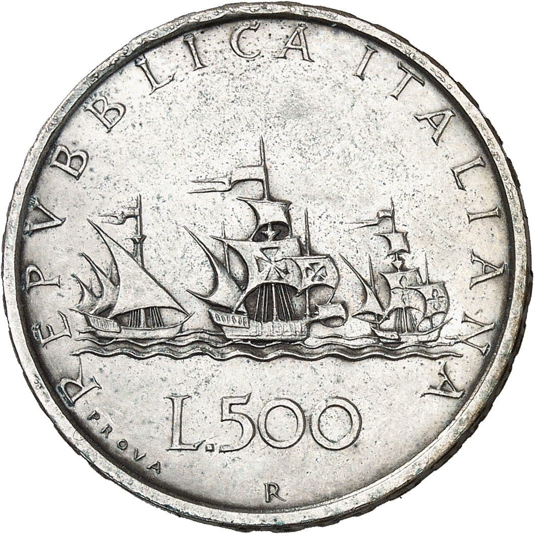 Av. REPVBBLICA ITALIANA. Trois caravelles à droite ; au-dessous L. 500 et (atelier) ; PROVA à gauche.