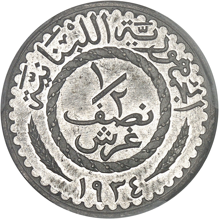 Av. REPUBLIQUE LIBANAISE. Couronne formée de deux palmes avec 1/2 PIASTRE et ESSAI au centre ; et (différent) (date) (différent) au-dessous.