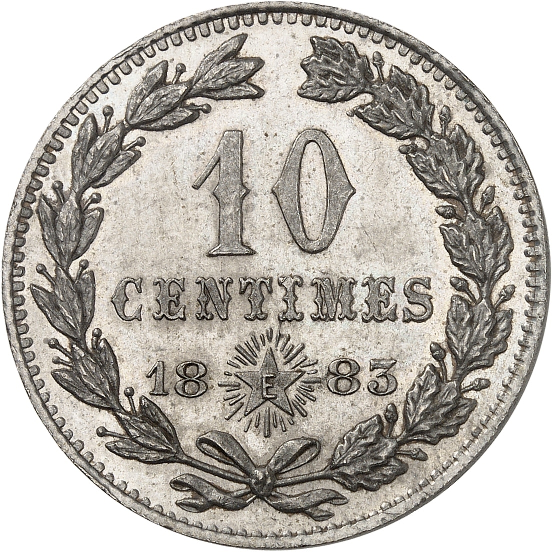Rv. Dans une couronne formée d’une branche de laurier et d’une branche de chêne : 10 CENTIMES (date). Séparant la date, une étoile rayonnante avec E en cœur.
