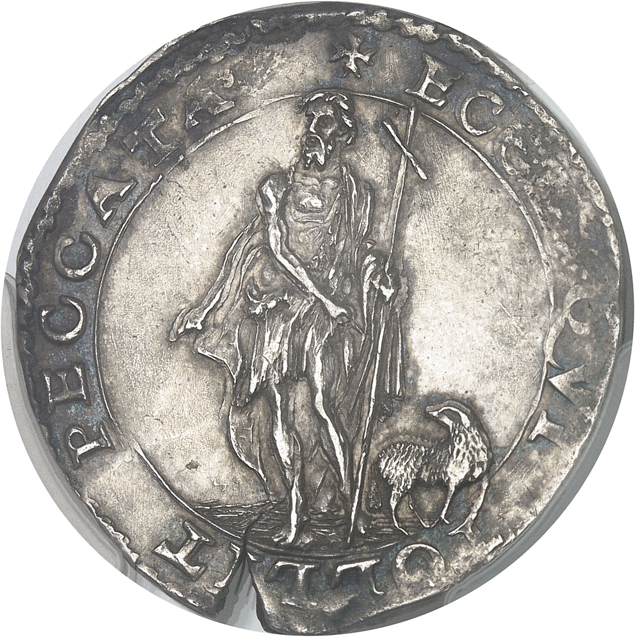 Rv. + ECCE QVI TOLLIT PECCATA. Saint Jean-Baptiste debout de face à gauche, avec une longue croix et l’agneau à sa gauche.