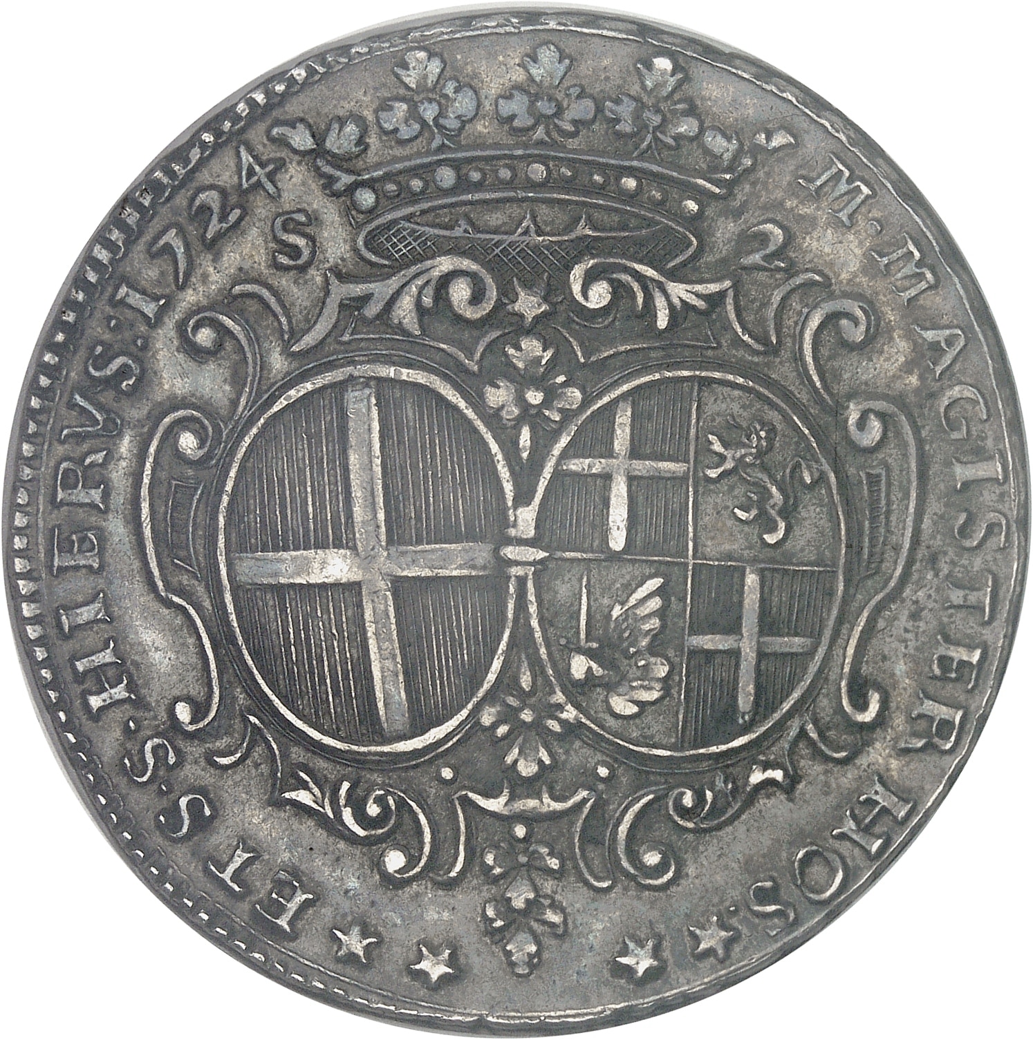Rv. M. MAGISTER HOS. ** - ** ET S. S. HIERVS: (date). Deux écus accolés, posés sur des cuirs et fleurons, aux armes de la Religion et du Grand-maître, écartelé aux 1 et 4 de la religion, au 2 d'argent à un lion de gueules ; au 3 de gueules à une main ailée d'or tenant une épée d'argent garnie d'or, posée en pal, sous une couronne ; autour S - 2.