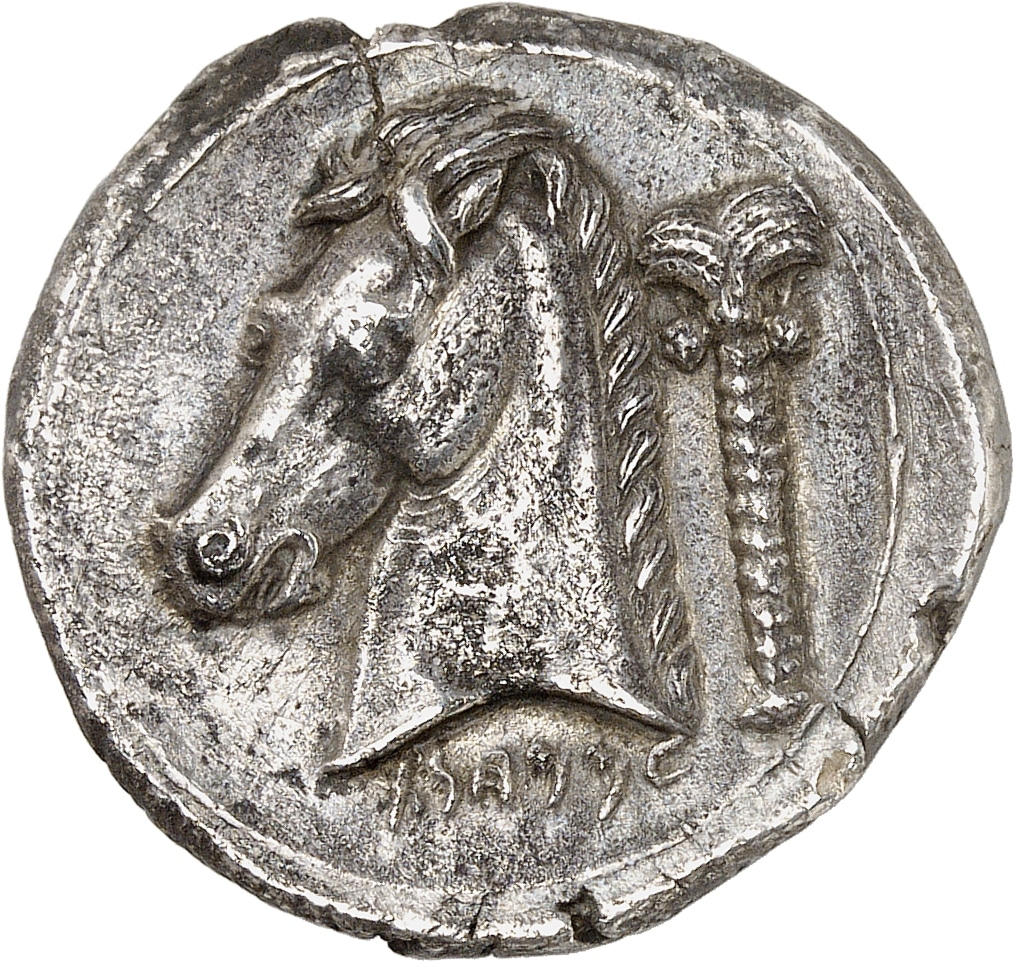 Rv. Tête de cheval à gauche ; derrière, un palmier ; à l'exergue, inscription punique MMHNT (Mechasbim).