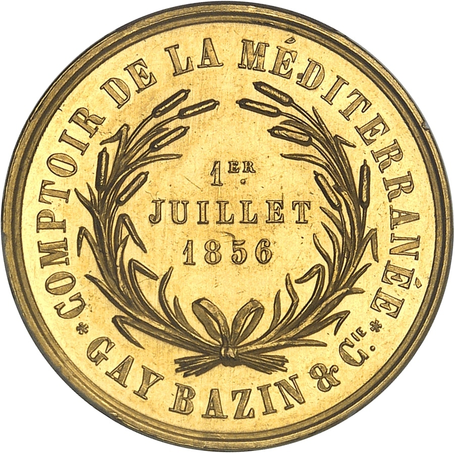 Rv. COMPTOIR DE LA MÉDITERRANÉE / GAY BAZIN & Cie. Dans une couronne formée de deux branches de roseaux : 1er JUILLET 1856.