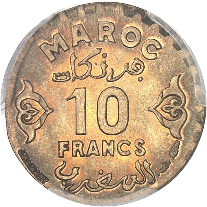 Rv. MAROC. Entre deux fleurons, au centre, 10 FRANCS ; signature J. HAINAUT à gauche et (différents) à droite.