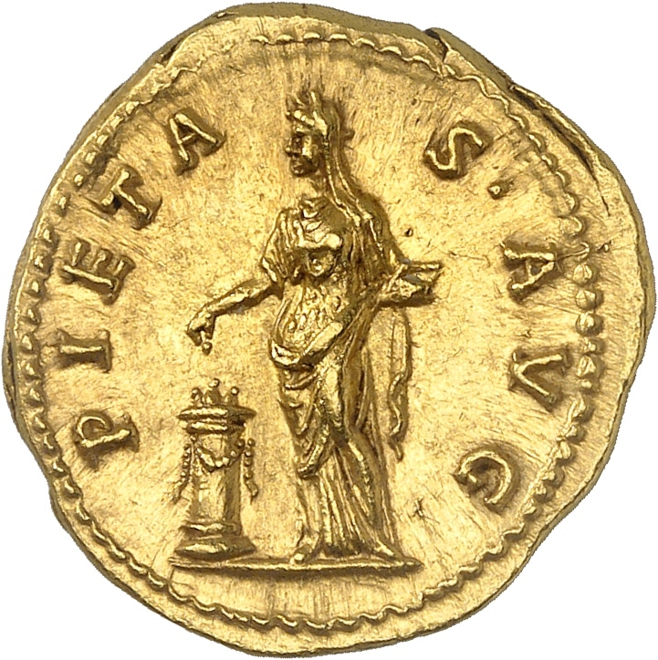 Rv. PIETA - S. AVG. La Piété drapée et voilée à gauche, déposant de la main gauche de l’encens sur un autel orné d’une guirlande et tenant une boîte de la main gauche.