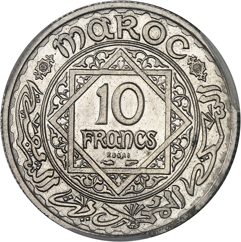- MOROCCO Mohammed V (1927-1961). Essai de 10 francs en maillechort, par Turin et Lindauer, Frappe spéciale (SP) AH 1346 (1927), Paris.
