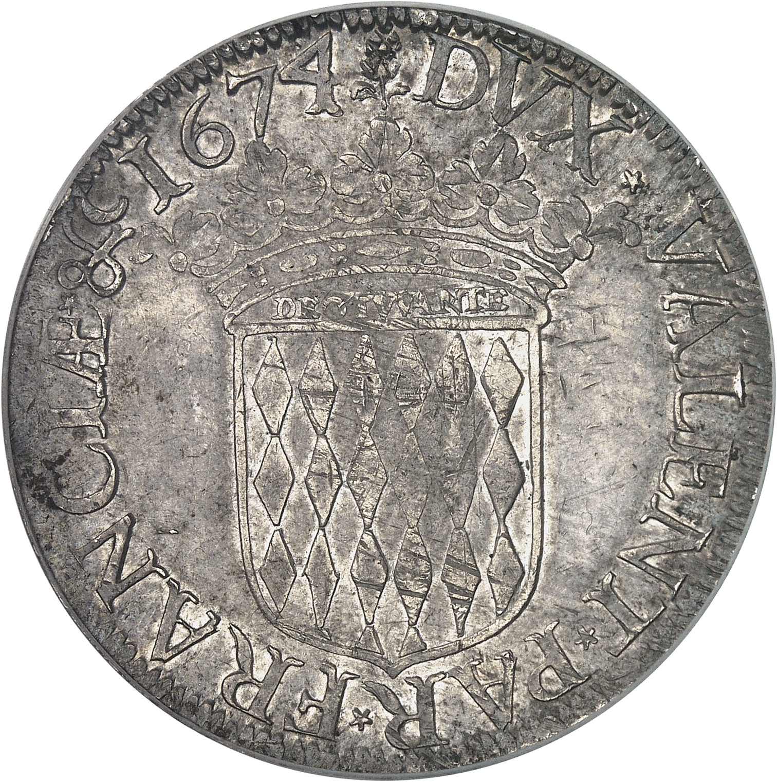 Rv. (différent) DVX* VALENT* PAR* FRANCIÆ* &c (date). Écu des Grimaldi surmonté d’une couronne ducale avec la mention DEO. IVVANTE.