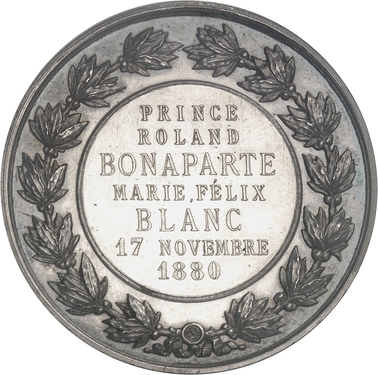 Rv. Dans une couronne formée de deux branches de laurier, dans le champ, en sept lignes : PRINCE / ROLAND / BONAPARTE / MARIE, FÉLIX / BLANC / 17 NOVEMBRE / 1880.