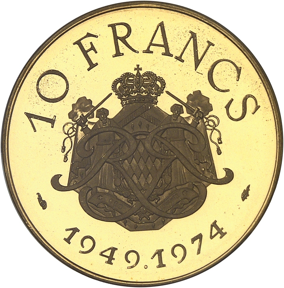Rv. 10 FRANCS. Écu des Grimaldi surmonté du chiffre de Rainier III ; au-dessous (différent) 1949.1974 (différent).