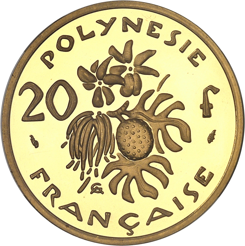 Rv. POLYNESIE / FRANÇAISE. Bouquet de fruits locaux accosté de 20 f ; signature AG au-dessous et (différents) sur les côtés.