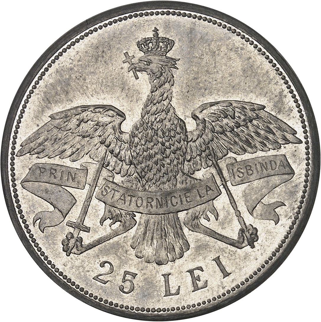 Rv. Aigle éployée couronnée, avec une croix dans son bec, tenant une main de justice et une épée, avec banderole PRIN STATORNICIE LA ISBINDA (La constance amène la victoire) ; au-dessous 25 LEI.