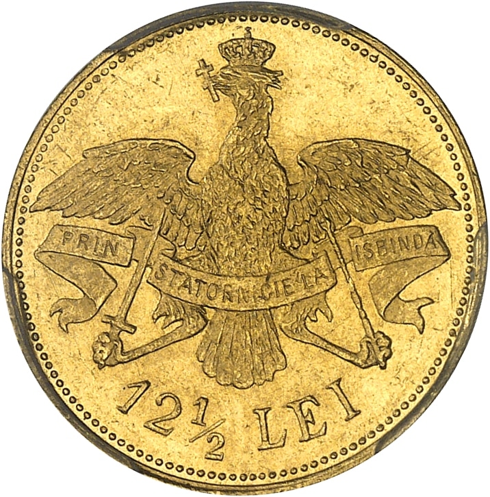 Rv. Aigle éployée couronnée, avec une croix dans son bec, tenant une main de justice et une épée, avec banderole PRIN STATORNICIE LA ISBINDA (La constance amène la victoire) ; au-dessous 12 1/2 LEI.
