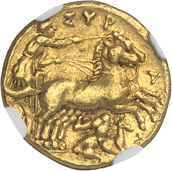 Rv. ΣΥΡ-Α-Κ-[ΟΣΙΩΝ]. Bige conduit par un aurige galopant à droite ; au-dessous, un triskèle.