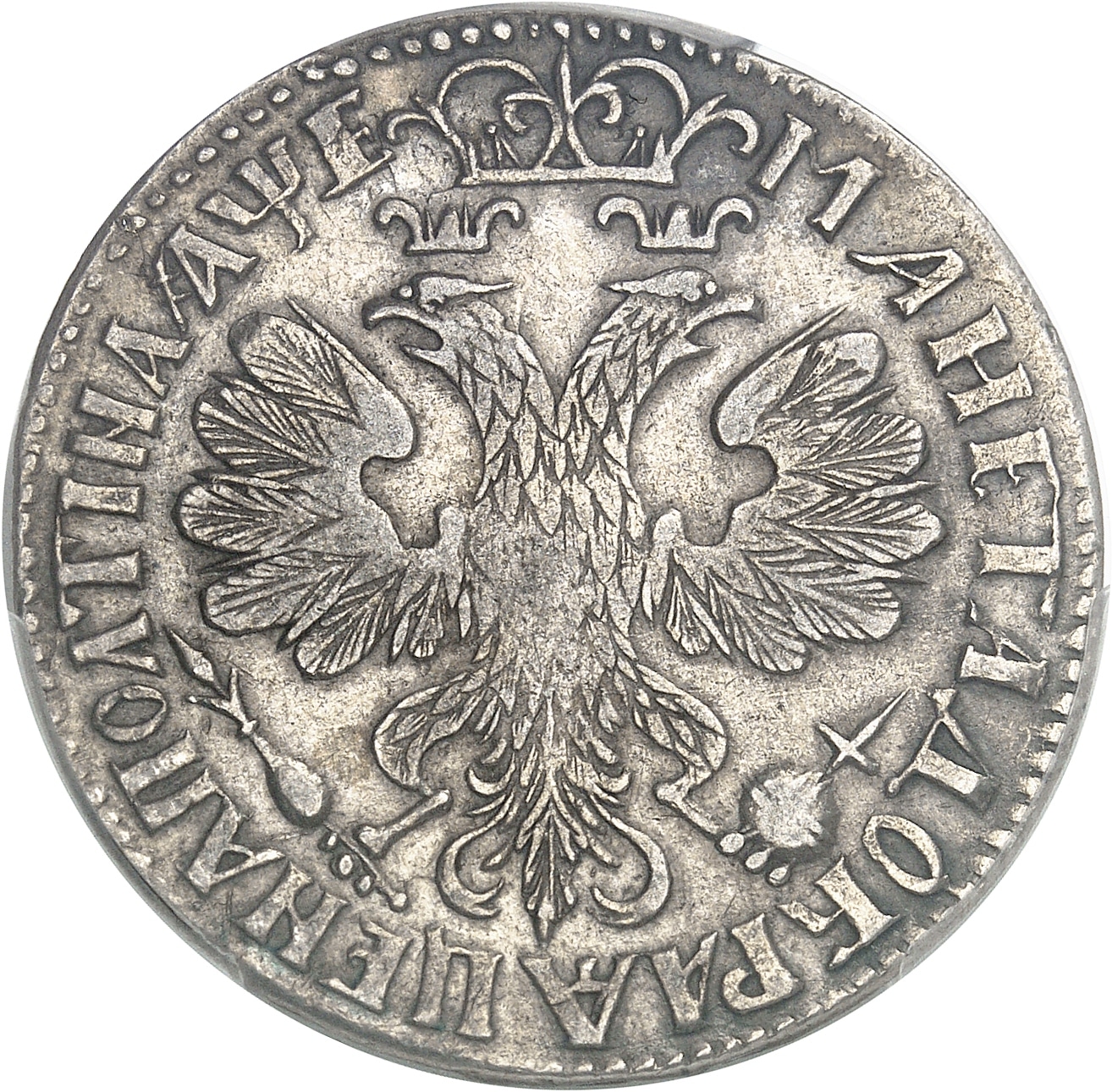 Rv. Légende en cyrillique. Aigle impériale bicéphale couronnée, tenant une orbe et un sceptre.