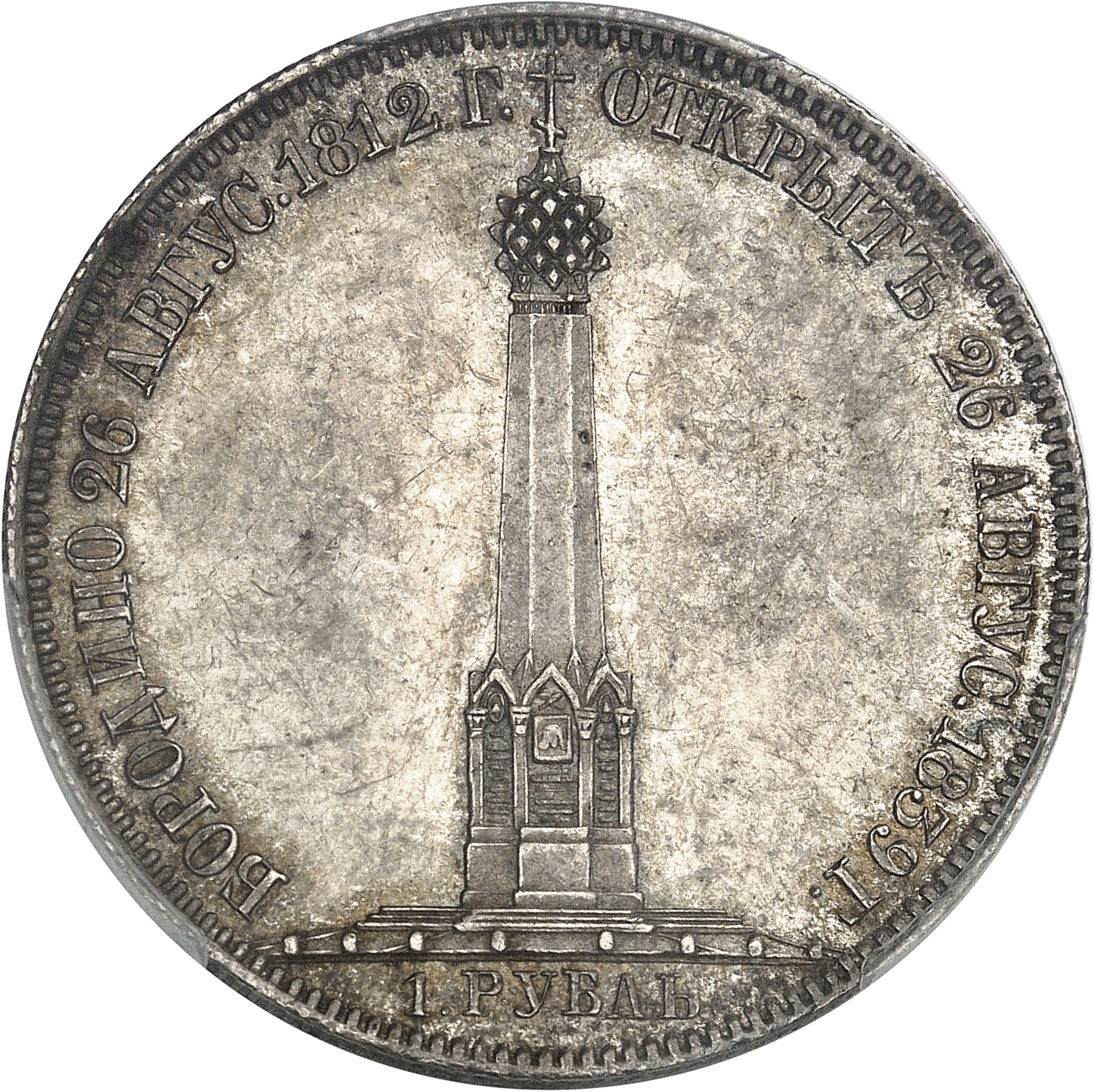 Rv. БОРОДИНО 26 АВГУС. 1812 Г. - ОТКРЫТЪ 26 АВГУС. 1839 Г. Le monument commémoratif de Borodino ; à l’exergue : 1 РУВЛЬ.