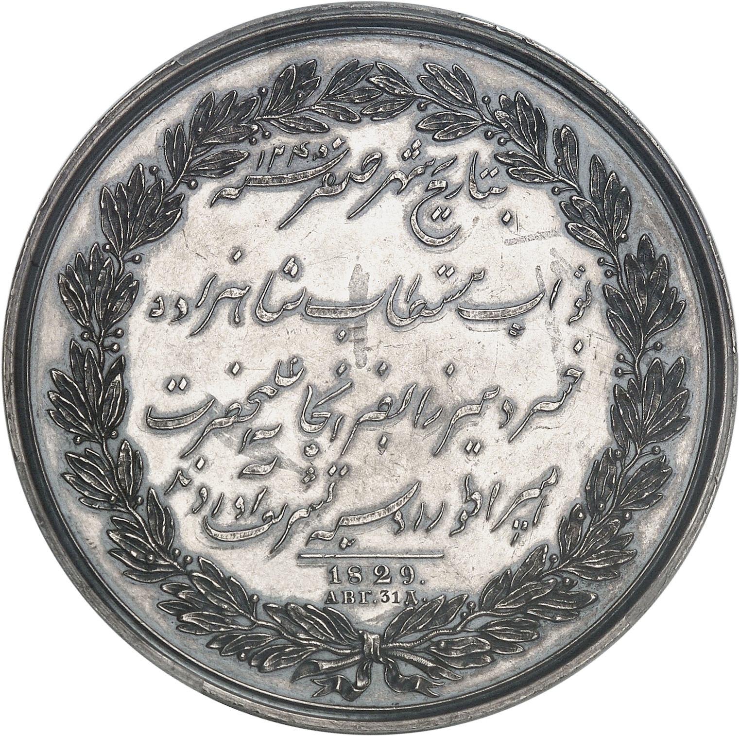 Rv. Dans une couronne formée de deux branches de laurier, légende en persan en quatre lignes avec (date) et АВГ (31) Д.