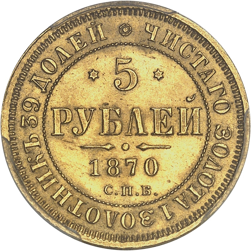 Rv. * ЧИСТАГО ЗОΛОТА 1 ЗОΛОТНИКЪ 39 ДОΛEЙ. Au centre : *5* PYБΛEИ (date) et (atelier).