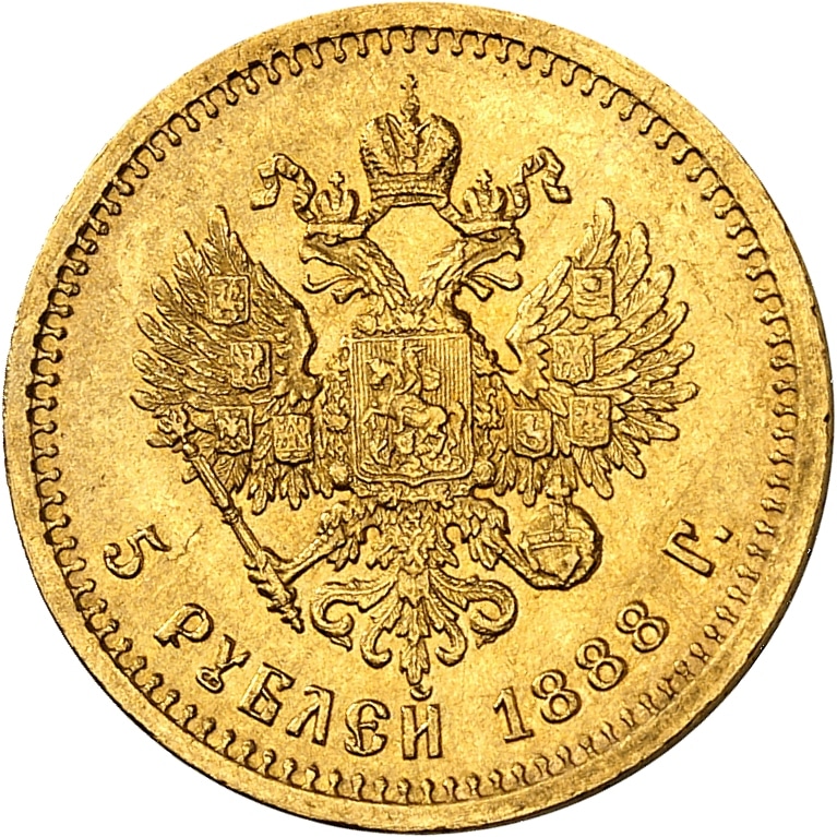 - RUSSIA Alexandre III (1881-1894). 5 roubles barbe longue, avec différent 1888 (АГ) / АГ, Saint-Pétersbourg.