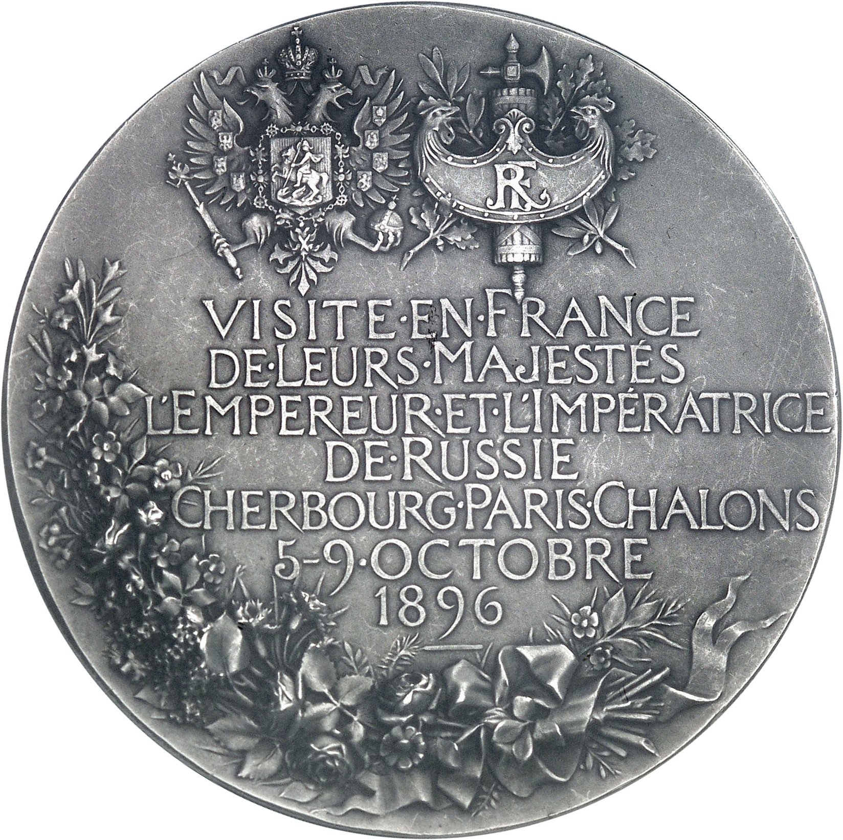 Rv. Armes de Russie et de la République française, au-dessous : VISITE. EN. FRANCE/ DE. LEURS. MAJESTÉS/ L'EMPEREUR. ET. L'IMPÉRATRICE/ DE RUSSIE/ CHERBOURG. PARIS. CHALONS/ 5-9 OCTOBRE/ 1896 et plus bas une couronne composite.