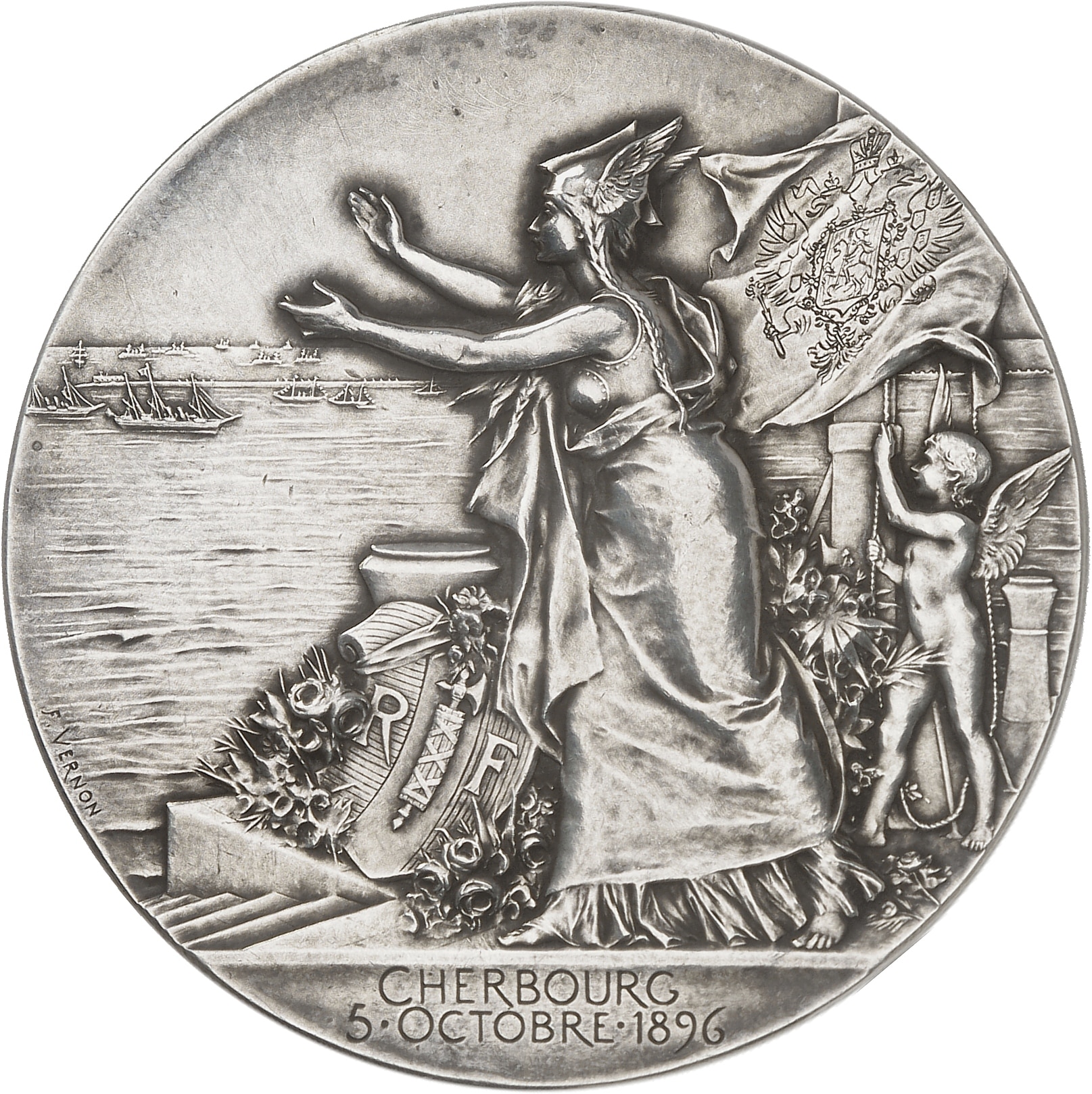 Av. CHERBOURG/ 5. OCTOBRE. 1896. À quai, accompagnée d'un chérubin hissant un drapeau russe, Marianne vêtue en gauloise accueille l'escadre russe que l'on aperçoit au loin ; à gauche signature F. VERNON.