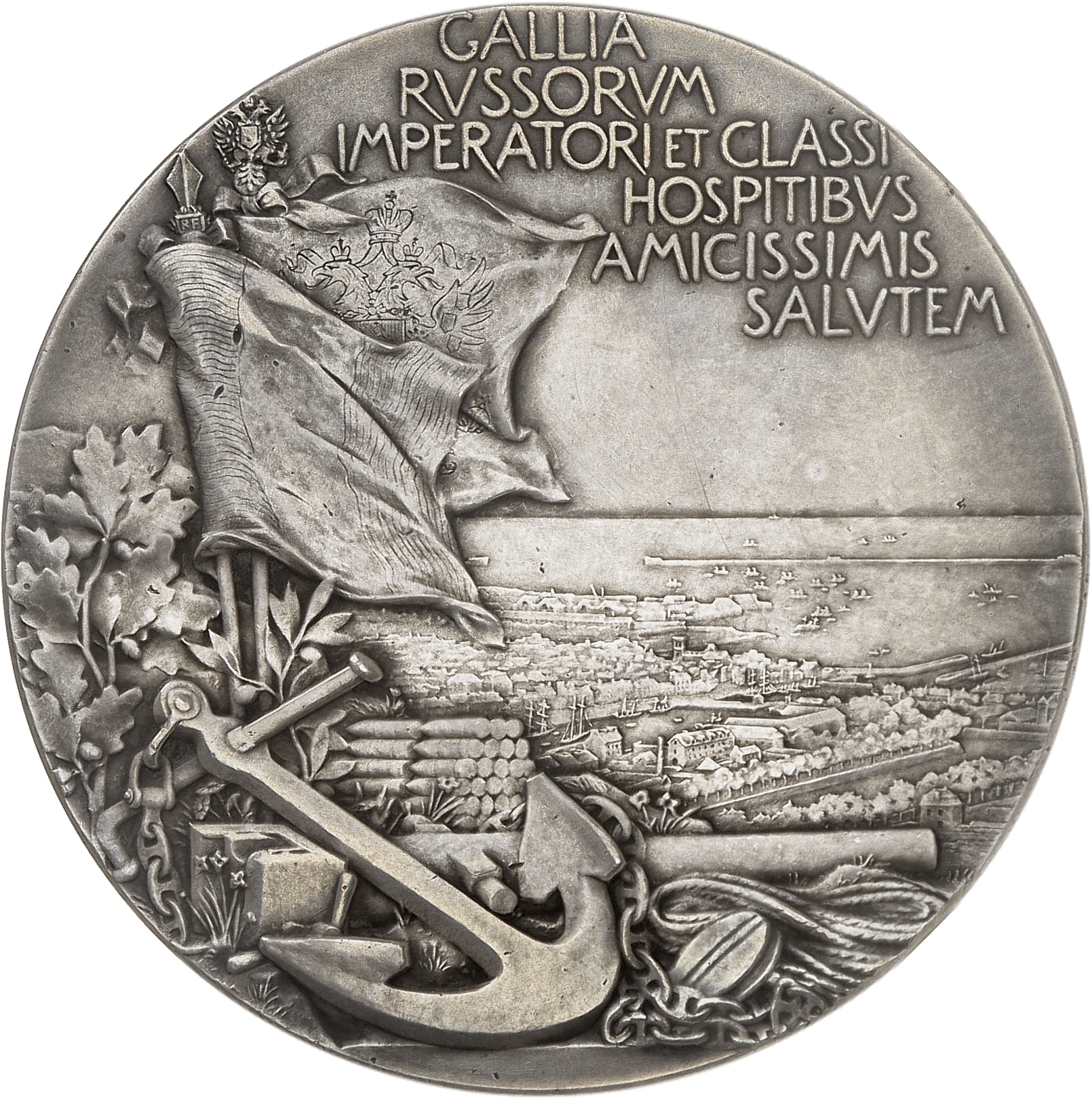 Rv. Drapeaux français et russe autour d'objets symboliques, dominant une vue générale de la ville de Cherbourg. Dans le champ l'inscription en six lignes GALLIA/ RVSSORVM/ IMPERATORI ET CLASSI/ HOSPITIBVS/ AMICISSIMIS/ SALVTEM.