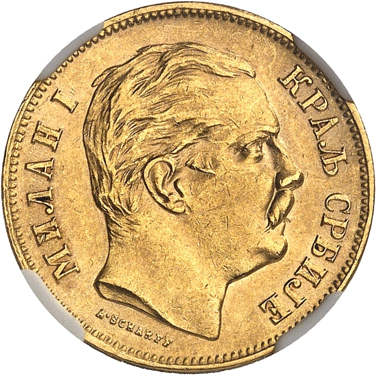 Av. МИЛАН I - КРАЉ СРЂИЈЕ. Tête nue à droite ; au-dessous, signature A. SCHARFF.