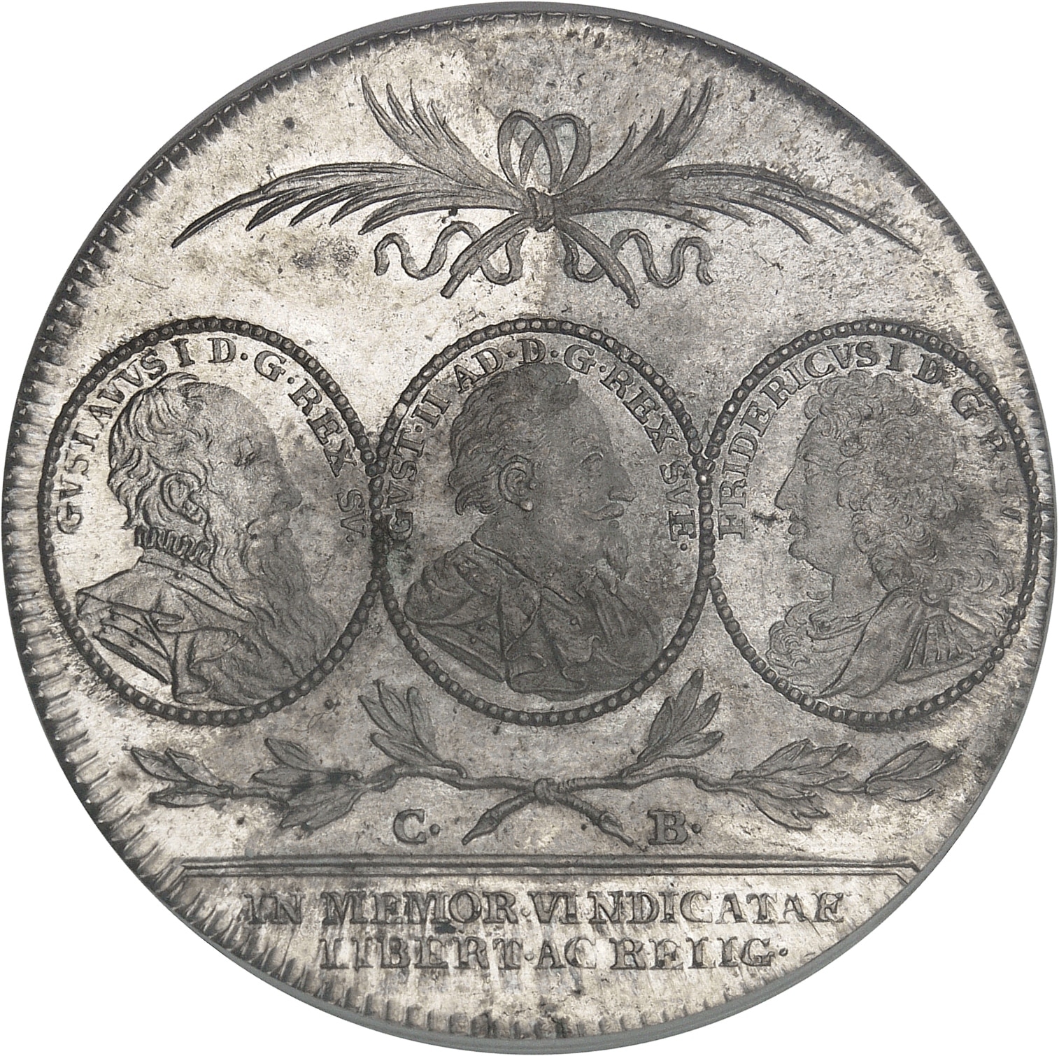 Rv. Sous deux palmes en sautoir, trois écus ovales avec GVSTAVVS I D. G. REX SV., GVST. II AD. D. G. REX SVE., et FRIDERICVS I D. G. R. SV, deux branches au-dessous avec (différent) ; à l’exergue : IN MEMOR. VINDICATAE LIBERT. AC RELIG.