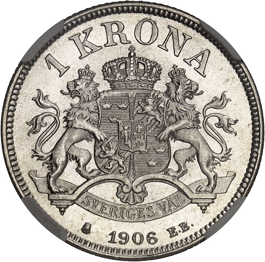 Rv. 1 KRONA. Sur un entablement, écu couronné et soutenu par deux lions couronnés, avec devise SVERIGES VÄL ; au-dessous, (différent) (date) (différent).