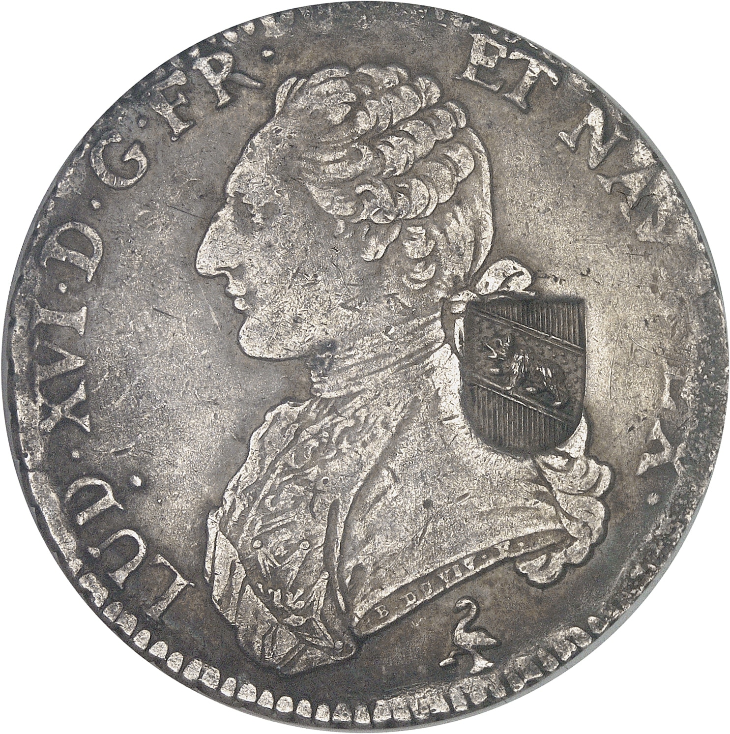 Av. LUD. XVI. D. G. FR. - ET NAV. REX. Buste du Roi à gauche, portant une veste brodée, avec l’ordre du Saint-Esprit, les cheveux noués sur la nuque par un ruban. Signature B. DUVIV. F. sur la tranche du buste ; au-dessous (différent) ; contremarque d’un écu de berne.