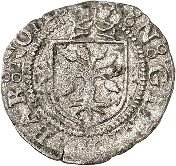 PCGS Genuine - Environmental Damage-VF Detail (60811551). Ce petit liard est rarissime : le type avec l’écu de Gilley au droit est pour 1555. Avec une patine grise. TB à TTB.