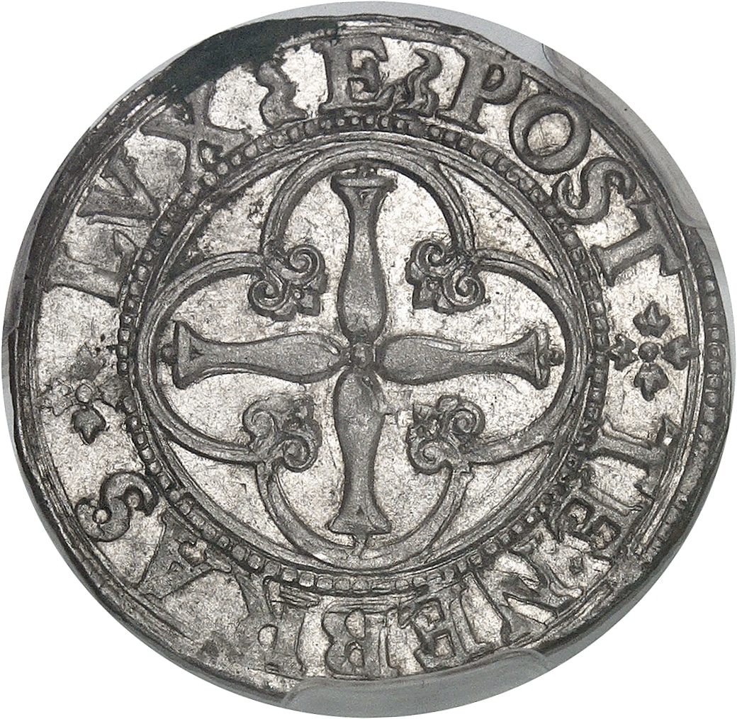 Rv. (différent) POST + TENEBRAS + LVX. Croix dans un quadrilobe aux angles rentrant fleuronnés.