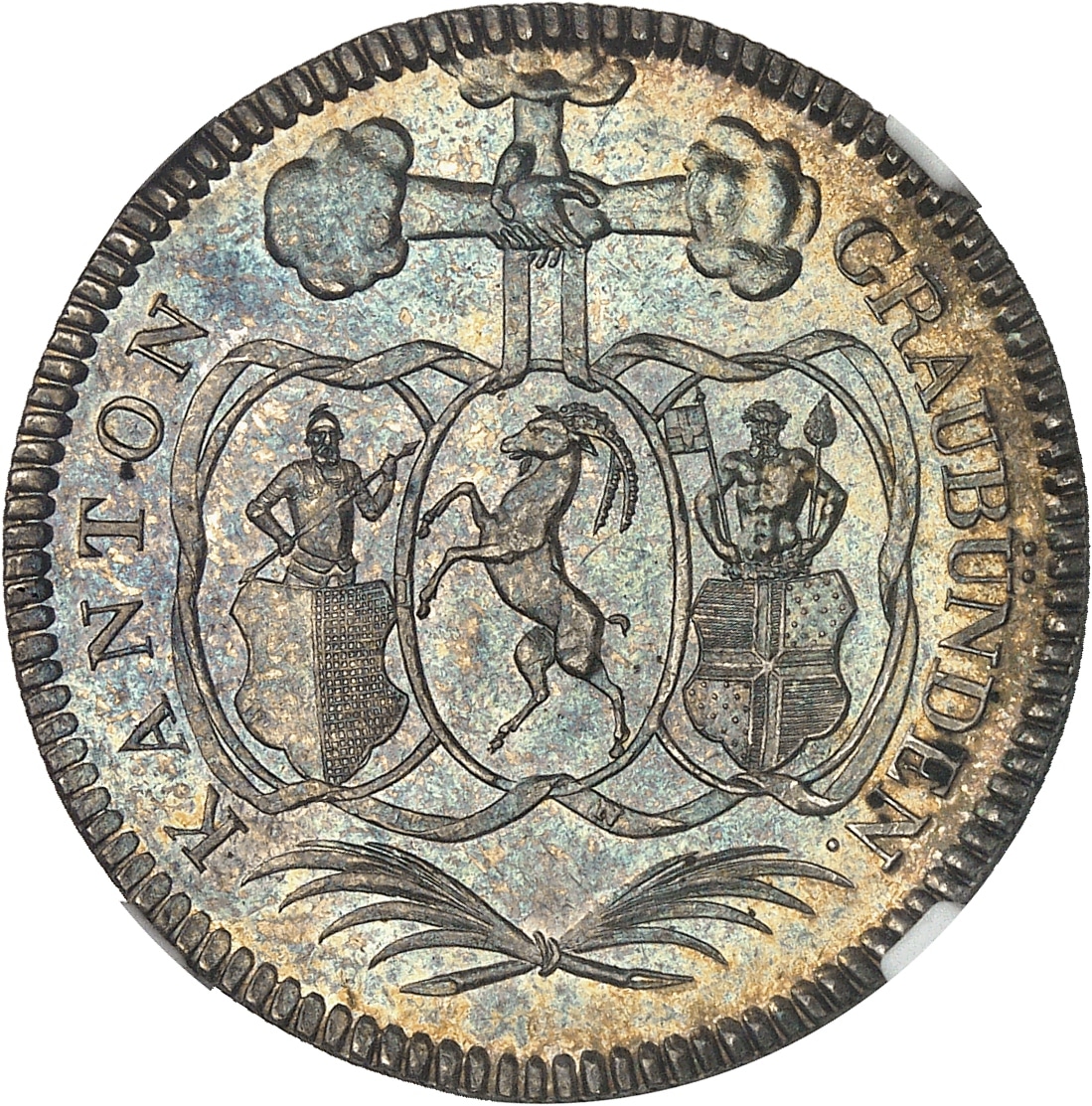 Av. KANTON - GRAUBUNDEN. Écus accolés de Gotteshausbund, Zehngerichtebund et Grauer Bund tenus par trois mains jointes sortant des nuées. Au-dessous, deux palmes en sautoir.