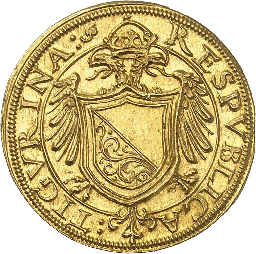 Av. RESPVBLICA - :TIGVRINA:. Écu de Zurich, tranché d'argent (blanc) et d'azur (bleu), avec fleuron, posé sur une aigle bicéphale éployée et couronnée.