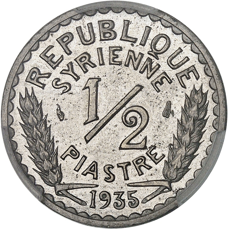 Av. REPUBLIQUE / SYRIENNE. Entre deux épis de blé : 1/2 PIASTRE et (différents) ; à l’exergue : (date).