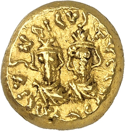 Av. /// IVS N / ICVS TVC //. Deux bustes impériaux de face, Héraclius à gauche et Héraclius Constantin à droite, portant la chlamyde, attachée sur l’épaule par une fibule et coiffés d’une couronne surmontée d’un ornement floral à trois feuilles.