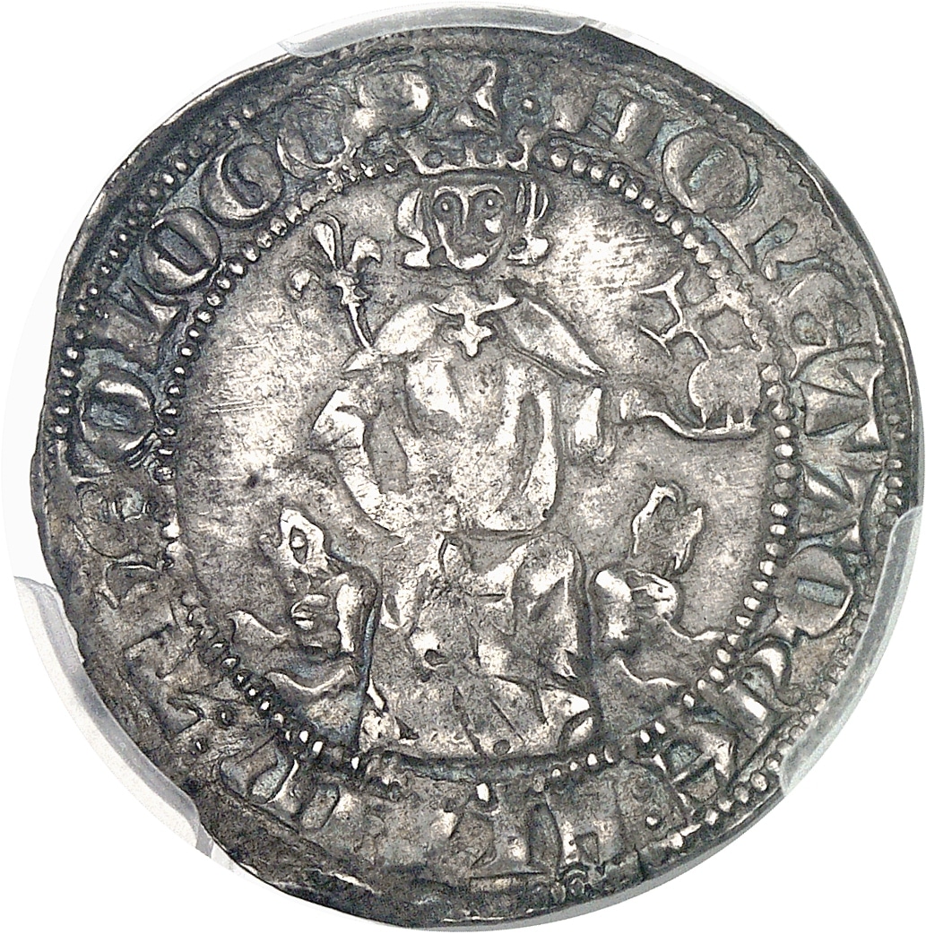 Av. + HONETA: QUE: FIT: IN: THEOLOGOS. Le Souverain couronné, assis de face sur un trône avec deux lions, tenant une croix crucigère de la main gauche et un sceptre fleurdelisé de la main droite.