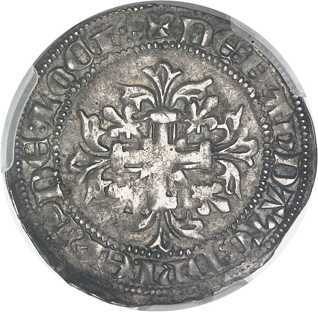 Rv. + DE: HANDATO: DNI: ENISDE: LOCI. Croix fleuronnée cantonnée de quatre lis divergent du centre.