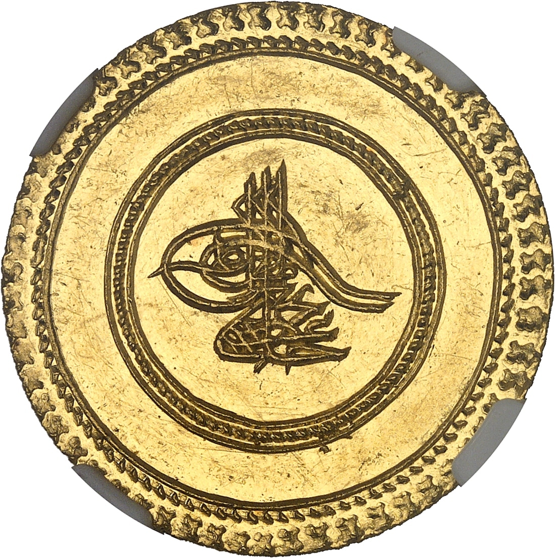 Av. Dans un double grènetis, extérieur et central, tughra.