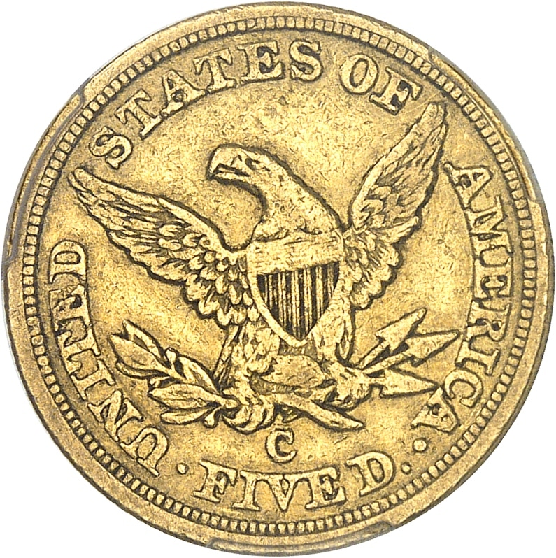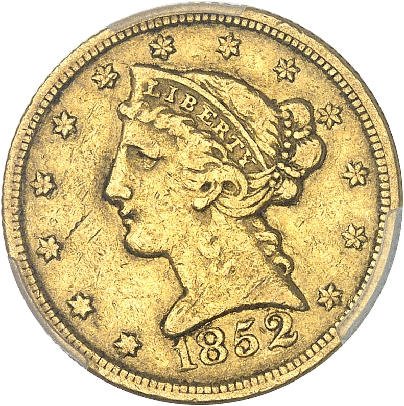 - UNITED STATES OF AMERICA République fédérale des États-Unis d’Amérique (1776-à nos jours). 5 dollars Liberty, sans devise 1852, C, Charlotte.