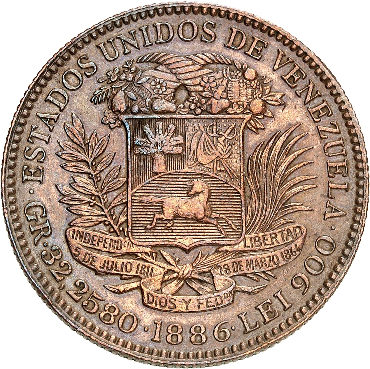 Rv. ESTADOS UNIDOS DE VENEZUELA / GR 32,2580 (date) LEI 900. Sous deux cornes d’abondance, écu du Venezuela posé sur une couronne de laurier et de palme. Au-dessous, banderole avec inscription en creux : INDEPEND 5 DE JULIO 1811 LIBERTAD 28 DE MARZO 1864 DIOS Y FEDon.
