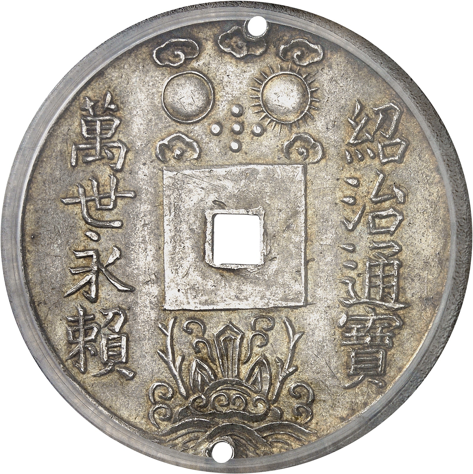 Av. Autour de la perforation centrale : Thieu Tri thông bao, à gauche « Monnaie courante de Tu Duc » et Van thê vinh lai, à droite « Toutes les générations en recueilleront le fruit à jamais » ; la lune et le soleil sous les nuages en haut ; les 3 montagnes avec les arbres des longévités au milieu de la mer en bas.