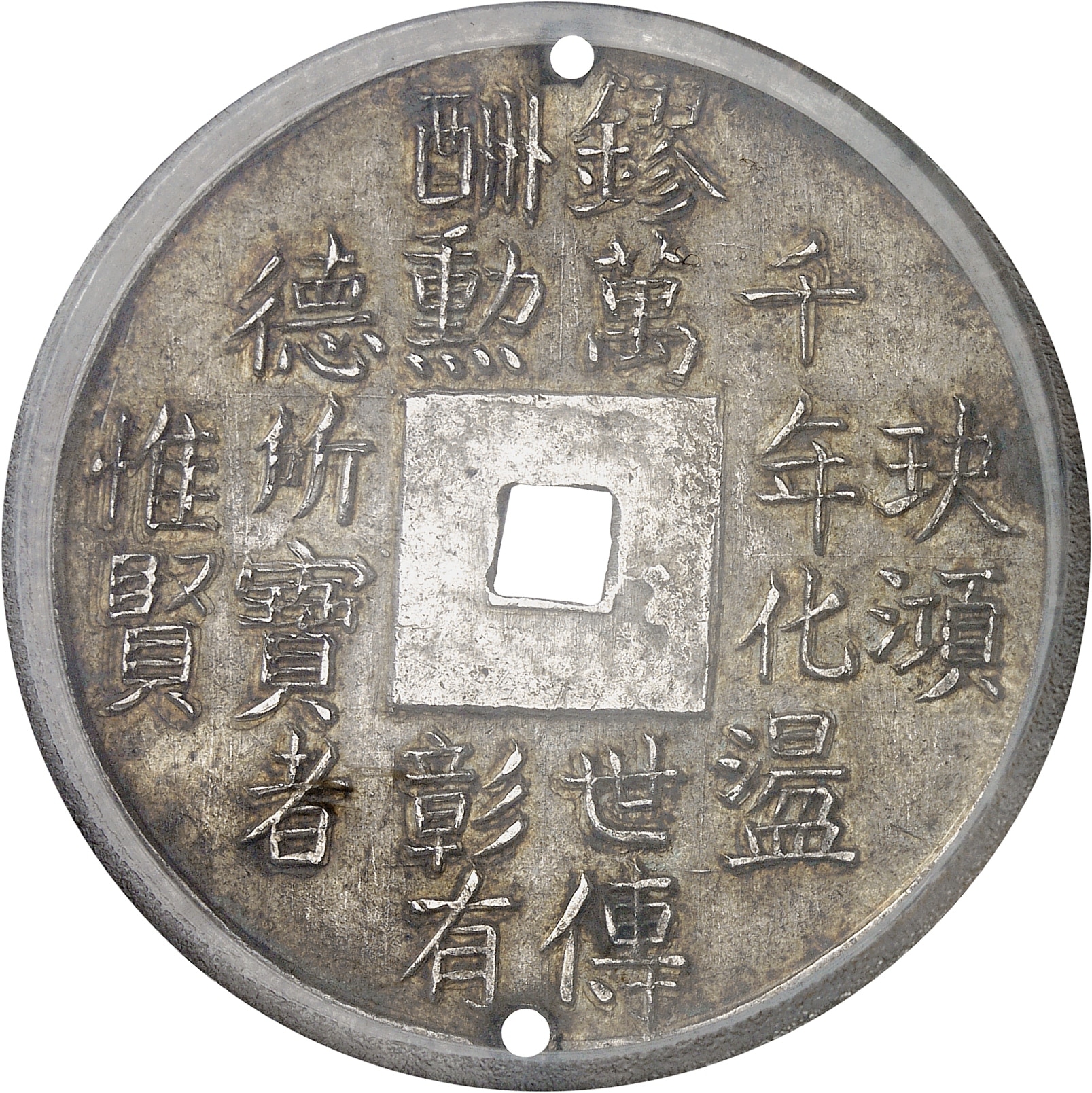 Rv. En caractères chinois, un quatrain “La pierre précieuse khuyet et le cinabre en mille ans se transmuent en or très pur transmissible à dix mille générations. Ainsi on reconnait le mérite et on met en relief les hommes vertueux, car la sagesse seule est précieuse”.