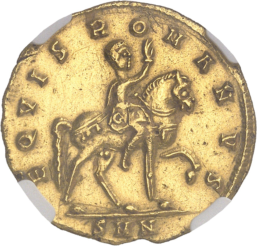 Au revers, le cavalier n’est pas l’Empereur mais semble plutôt une personnification de la chevalerie romaine (ordo equester), l’un des piliers de la tradition romaine. Ce médaillon de 1 1/2 solidi était présent dans de grandes collections comme de Hirsch ou Trau