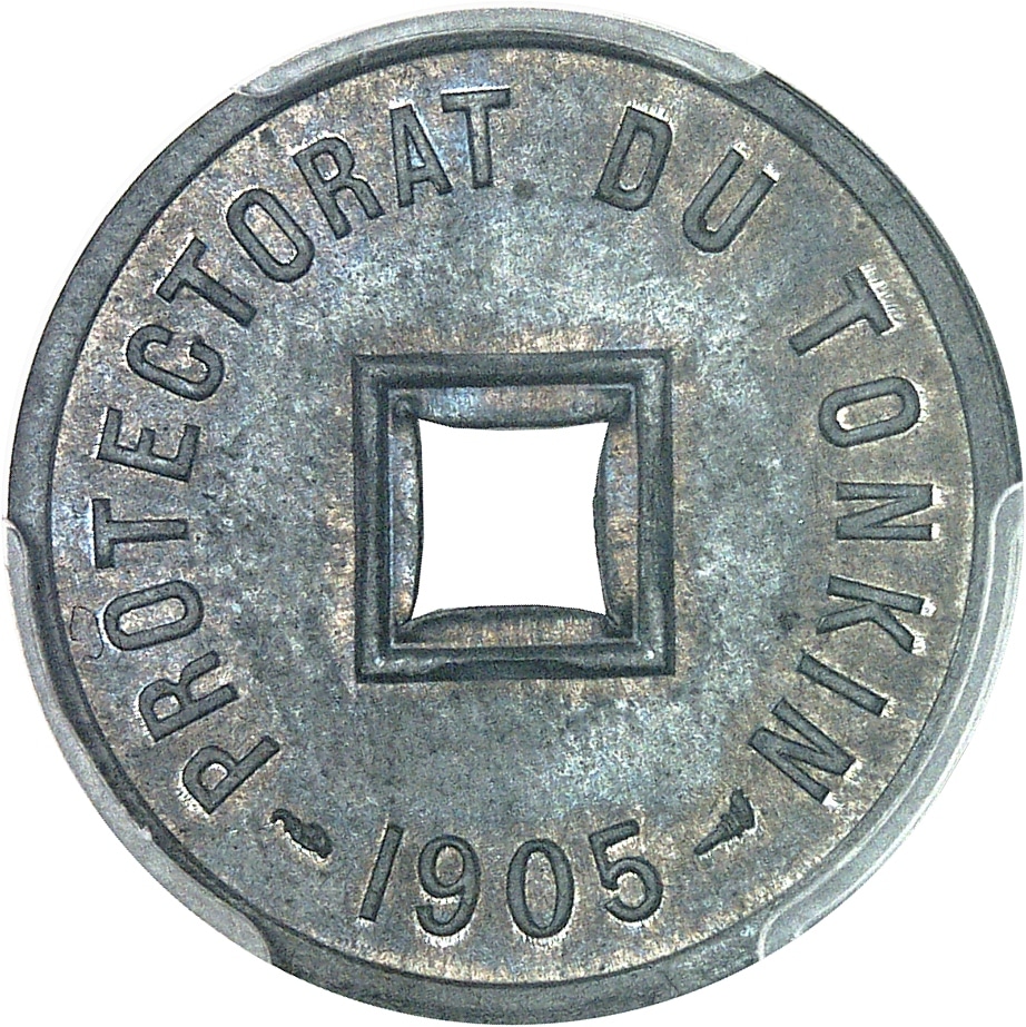 Av. PROTECTORAT DU TONKIN. Carré central en relief, avec perforation centrale ; au-dessous (différent) (date) (différent).