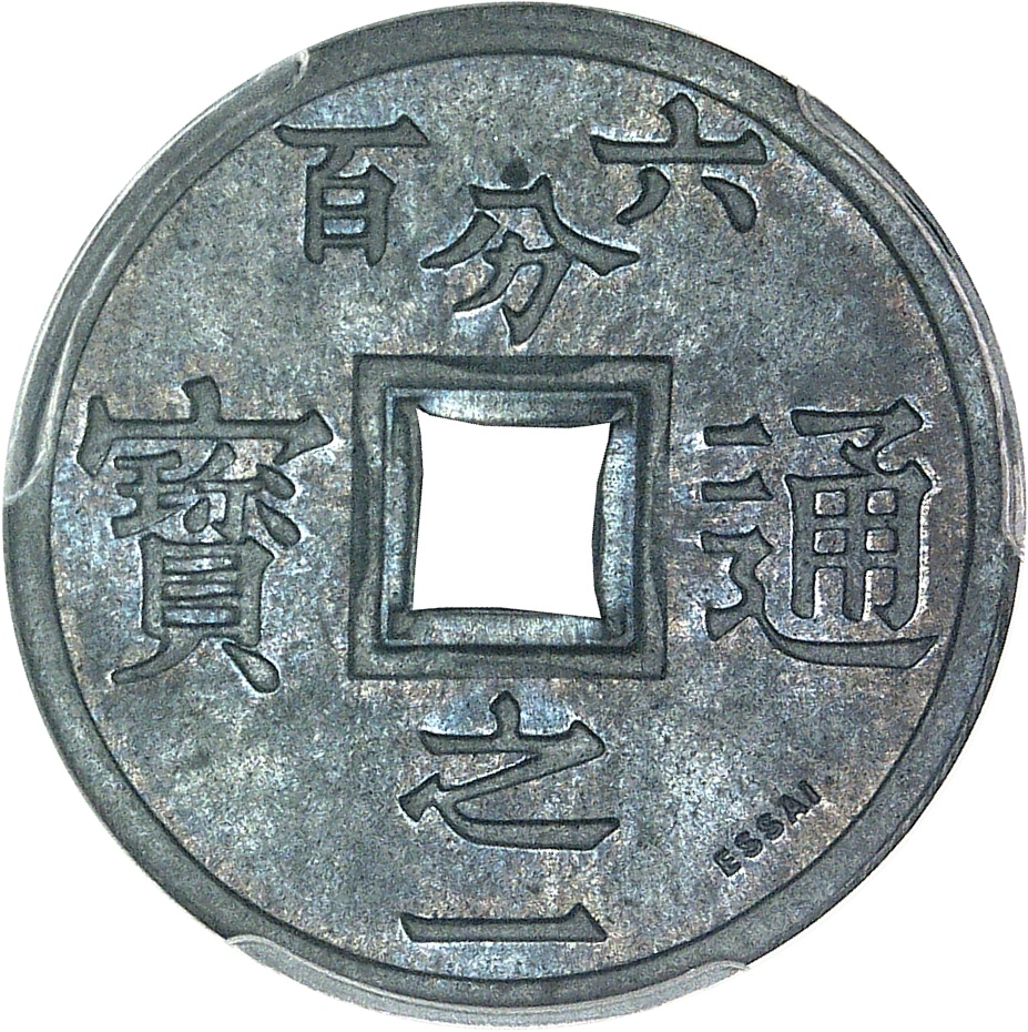 Rv. Caractères chinois “monnaie courante 1/600e” autour du carré central en relief, avec perforation centrale ; dans le champ à droite ESSAI.