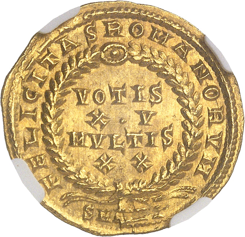 Rv. FELICITAS ROMANORVM / SMANZ (?). Dans une couronne : VOTIS XV MVLTIS XX.