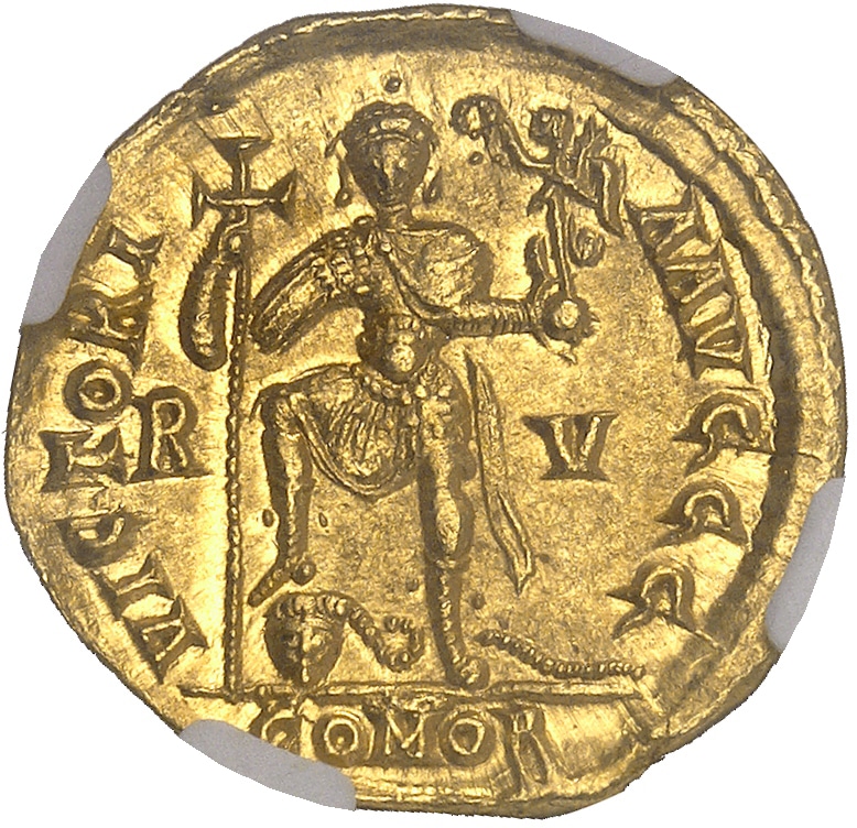 Rv. VICTORI - A AVGGG / COMOB. L’Empereur debout de face tenant une victoriola de la main gauche et le labarum de la main droite, le pied droit posé sur une tête, accosté de R - V.